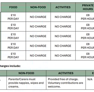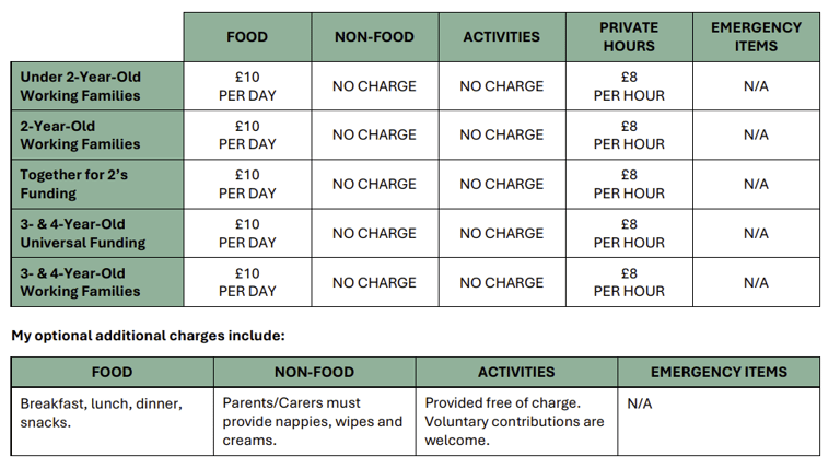 An emergency charge can be applied by the Early Years Provider for parents/carers who opt in to pay additional charges, but do not supply the required item/food. These are also listed below if applicable.
